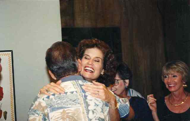 Jerry Smith gives a hug to Sidney (Sudberry) Greathouse while Ann (White) Truscott and Janet (Baber) Blankenship look on.