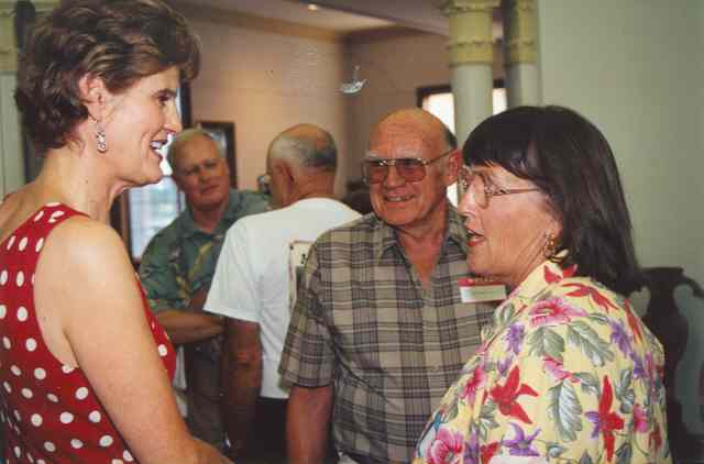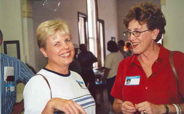 Marilynn Blackmon speaks with Mary Ellen Brady(?) while (?) and Holley (Robinson) Izard visit in background.