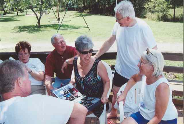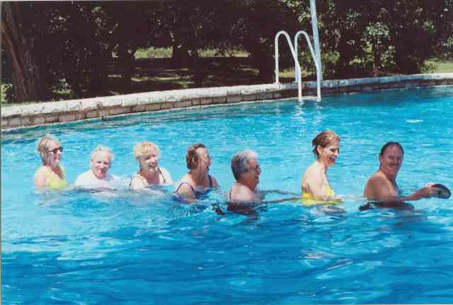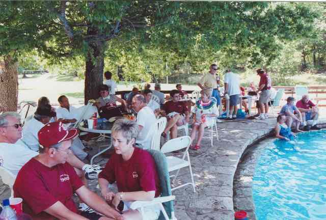 Some are not put off by cold water. Conga line (front to rear): Stu Gluckman, Sidney (Sudberry) Greathouse, Jackie Walker, Sherri (Jackson) Knight, Nancy (Dveney) Pendergrath, Joe Knickmeyer, Janet (Baber) Blankenship.