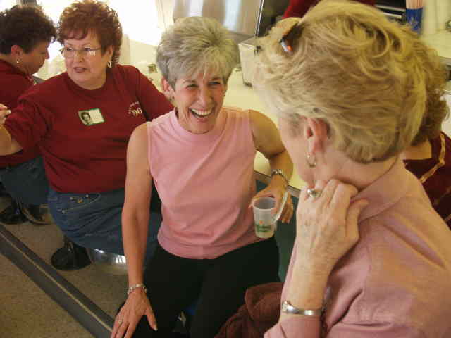 Marilynn and Judy share a laugh. Zuda speaks with someone out of view. Jean contemplates her meal.(Should she or shouldn't she?)