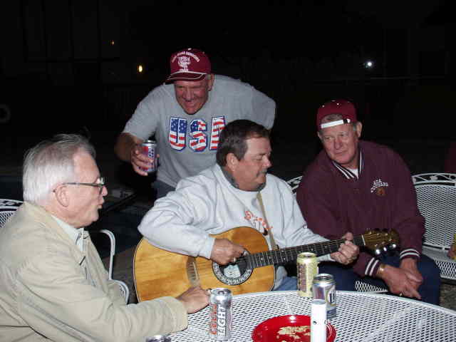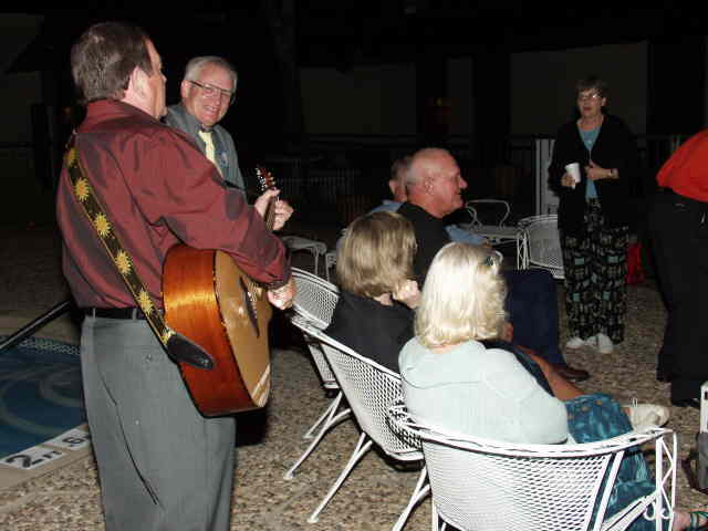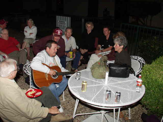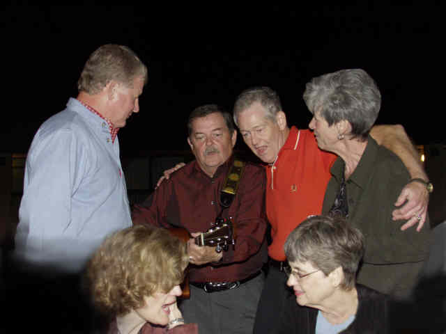 Left to right: Joe, LeDon, Richard, Nancy, Charlie, Jerry, Carolyn, John, Sidney(hidden?), and Marilynn listen to John Fred's playing and singing.
