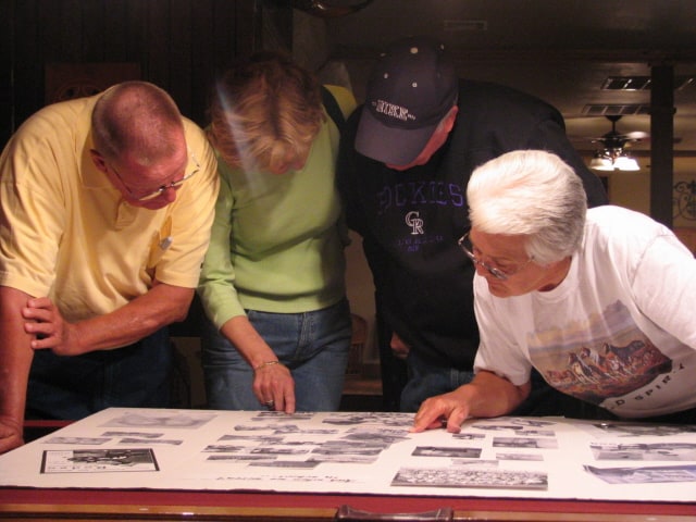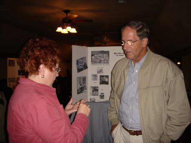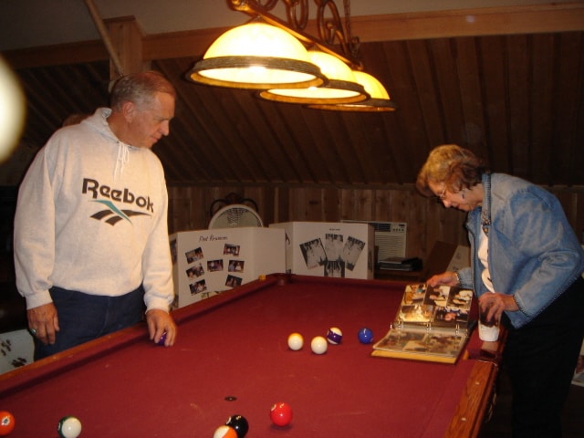 Dick Davenport looks on as Sherri examines on of the albums of photos from previous reunions.