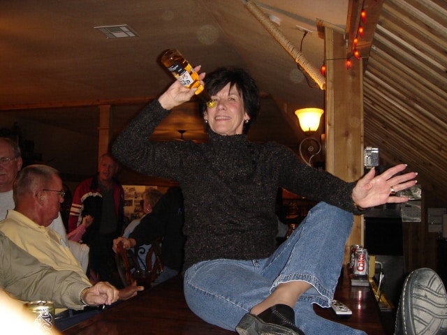 Marilynn acting up at the bar. Notice the bottle is still capped.