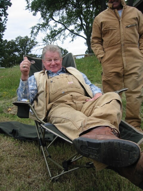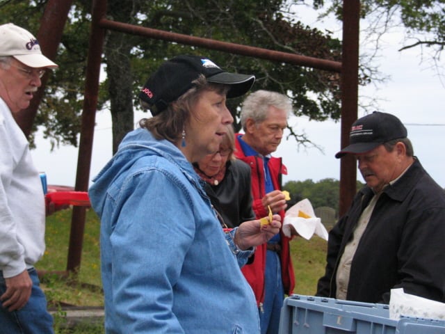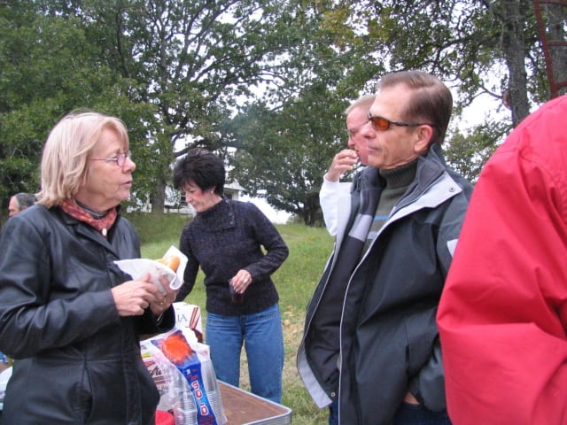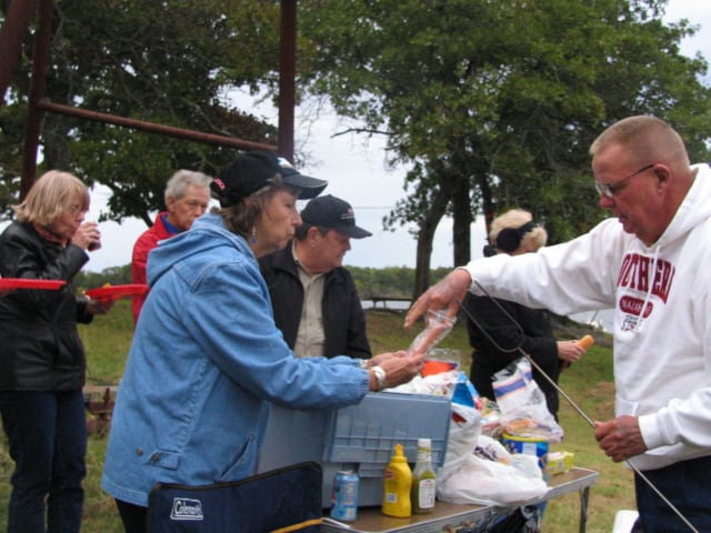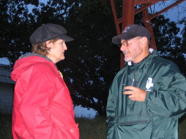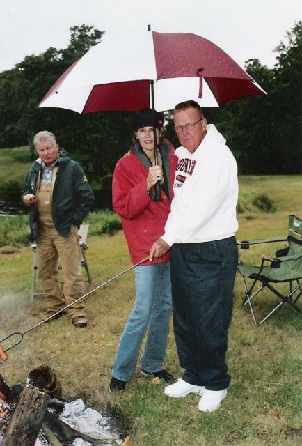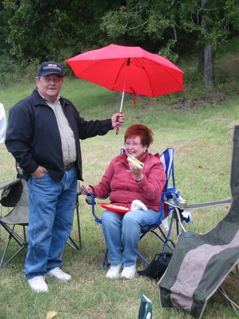 Zuda dragooned John Fred to protect her hot dog from the rain.